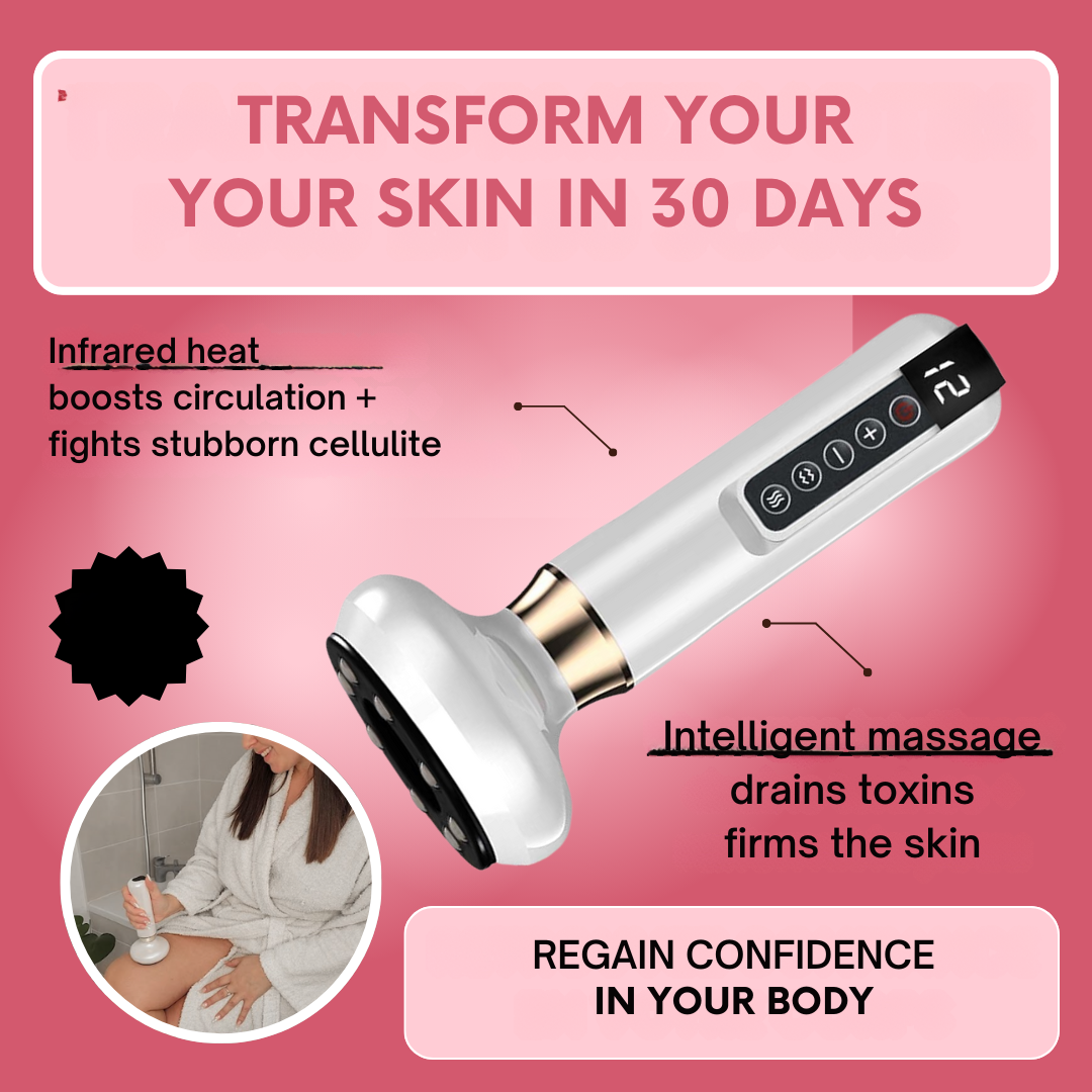 Grâce à sa technologie de massage profond, ce dispositif agit en profondeur pour stimuler la circulation, lisser la peau et réduire les capitons liés à la cellulite et au relâchement cutané.